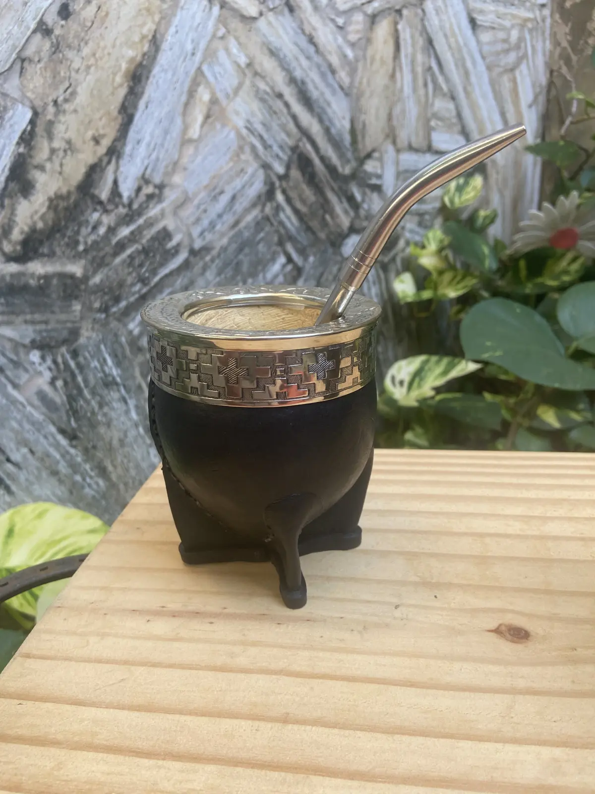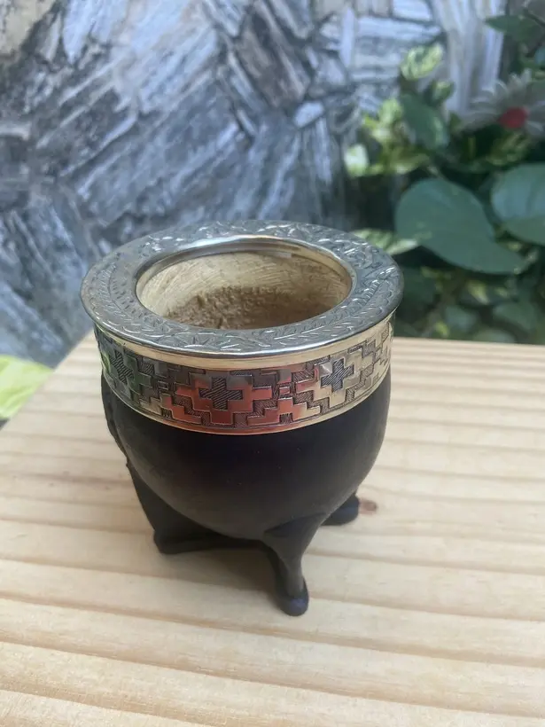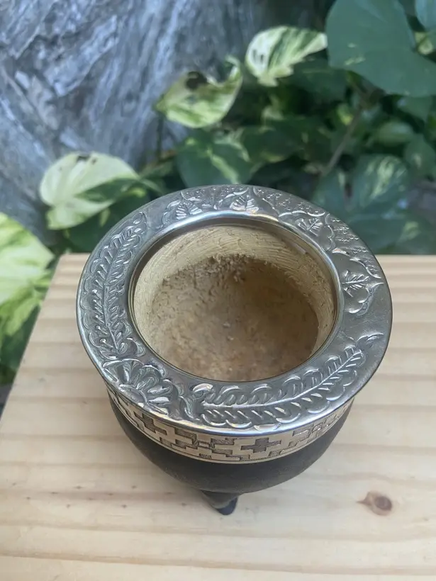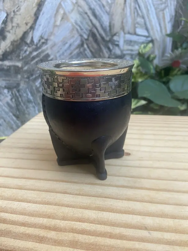 * Mate artesanal, hecho de calabaza con virola labrada artesanalmente de alpaca, forrado en cuero.